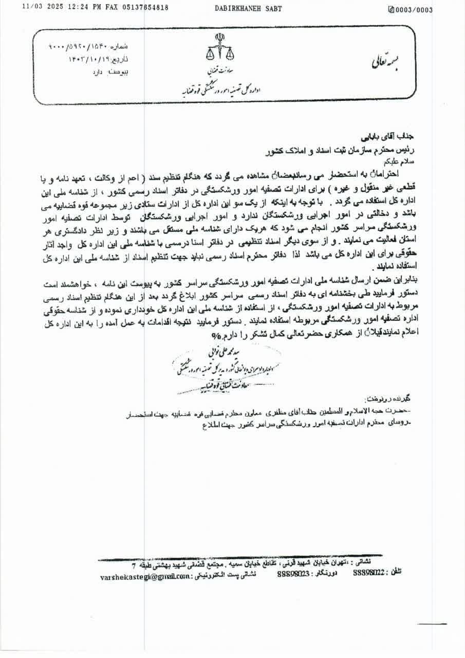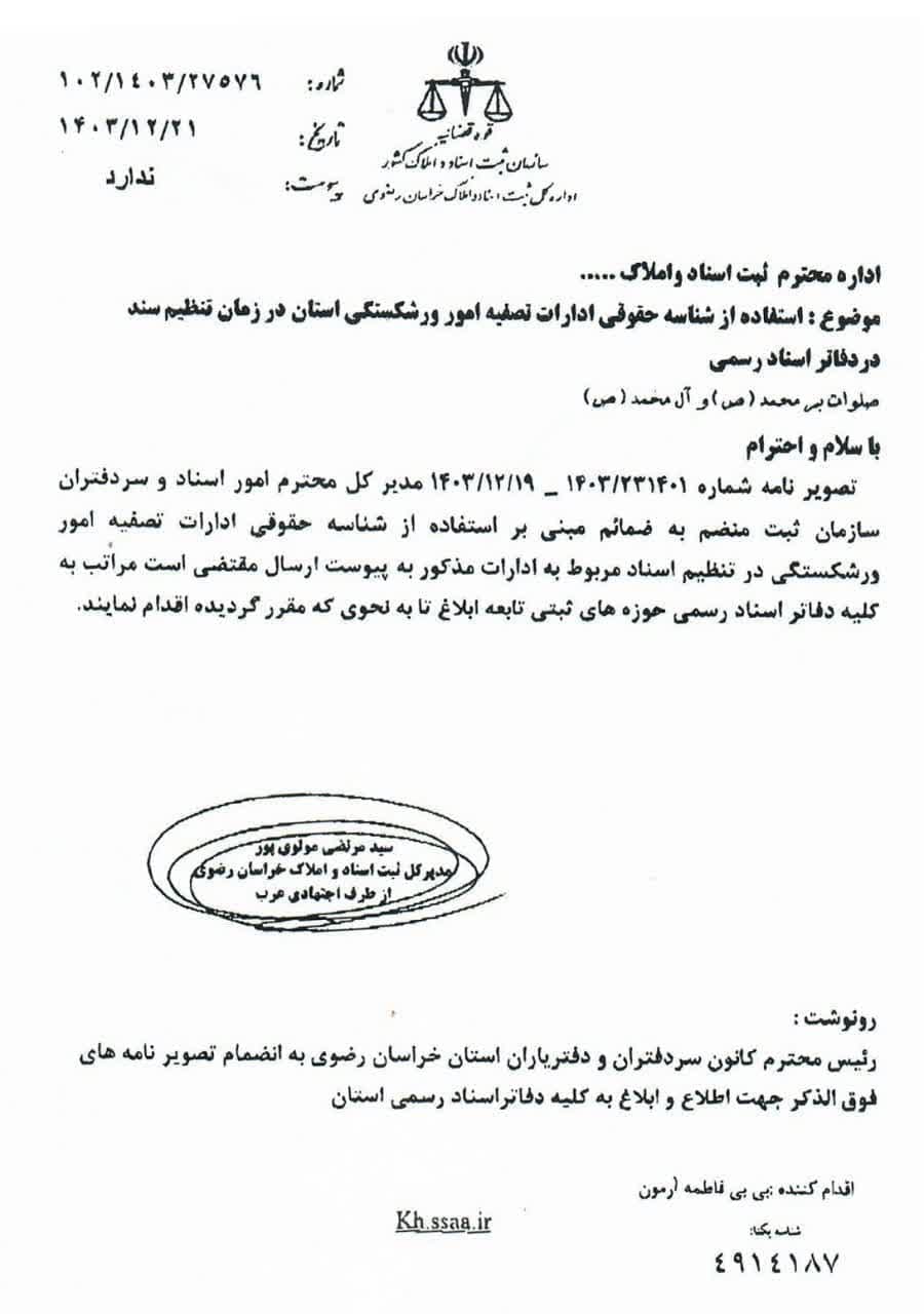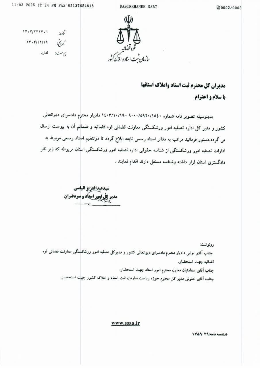 تصویر نامه 102/1403/27579 مدیر کل ثبت استان و نامه مدیر کل امور اسناد و نامه دادیار دادسرای دیوانعالی کشور و مدیر کل تصفیه و امور ورشکستگی معاونت قضائی قوه قضائیه نسبت به خودداری از استفاده شناسه ملی اداره کل تصفیه امور ورشکستگی قوه قضائیه