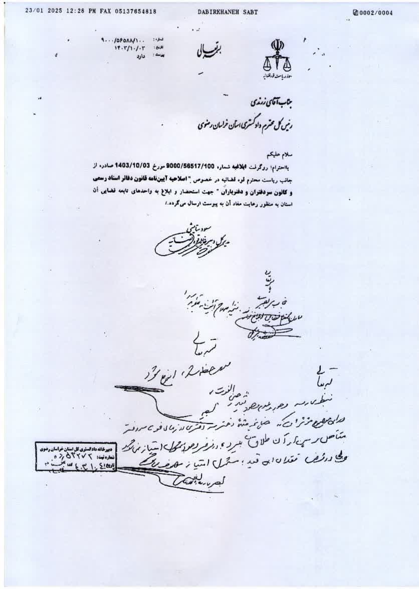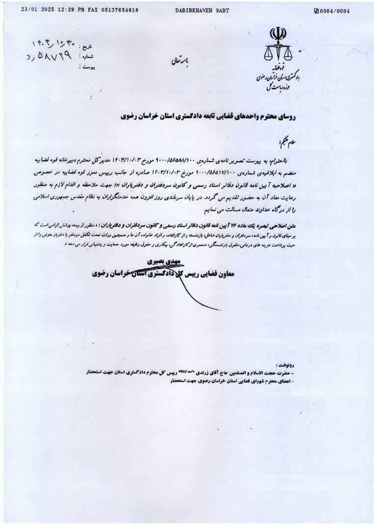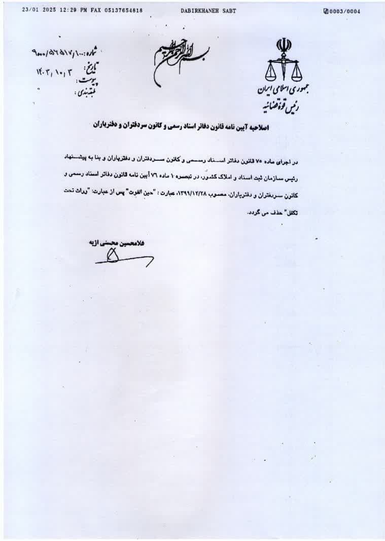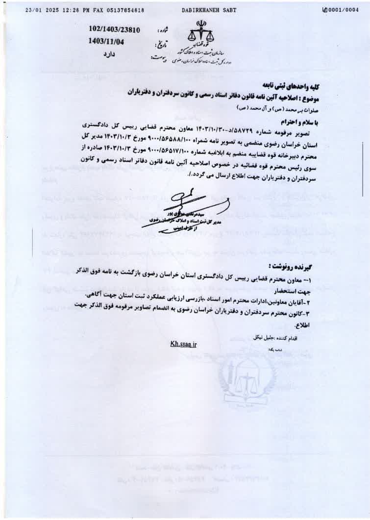 تصویر نامه 102/1403/23810 مدیر کل ثبت استان و نامه شماره 9000/56588/100 مدیر کل دبیرخانه قوه قضائیه و اصلاحیه آئین نامه قانون دفاتر اسناد رسمی و کانون سردفتران و دفتریاران جهت استحضار همکاران