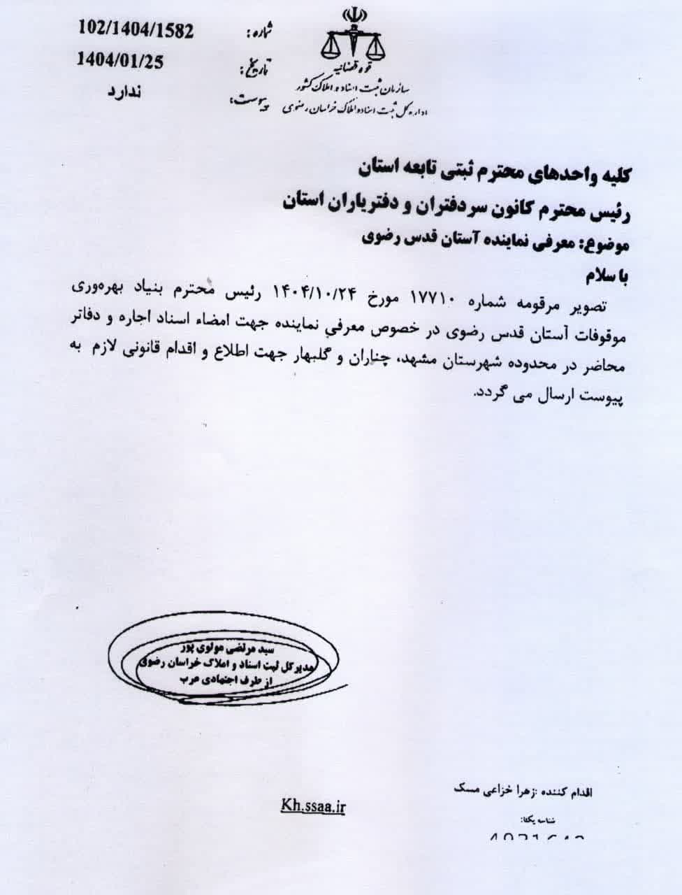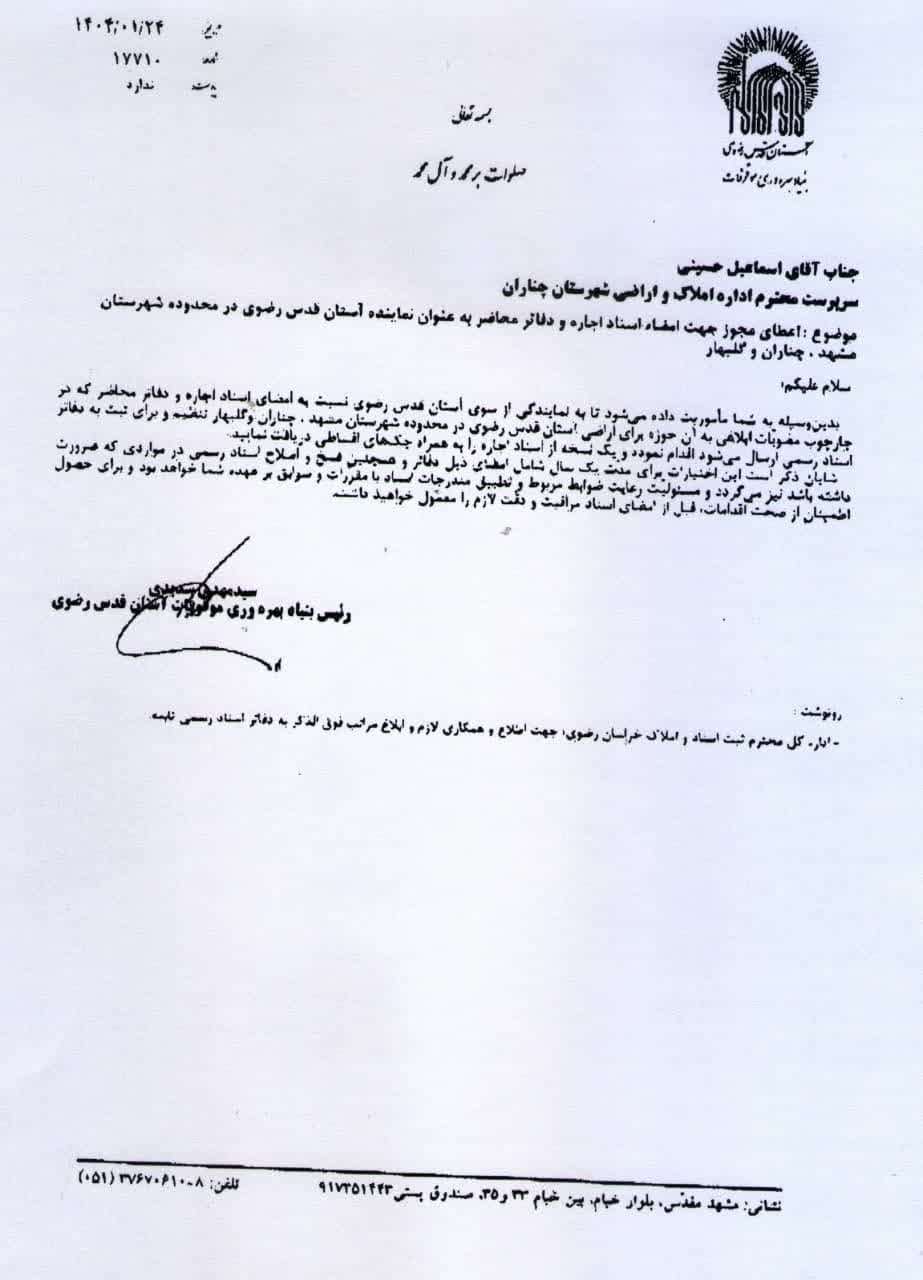 تصویر نامه مدیر کل محترم ثبت استان و رئیس محترم بنیاد بهره وری موقوفات آستان قدس رضوی با موضوع معرفی نماینده جهت امضاء اسناد اجاره تنظیمی دفاتر اسناد در محدوده شهرستان های مشهد، چناران و گلبهار