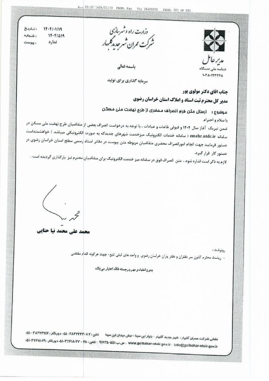 تصویر نامه شماره 1404/519 مدیر عامل محترم شرکت عمران شهر جدید گلبهار مبنی بر تنظیم اقرار نامه با موضوع انصراف مطابق متن ذیل: