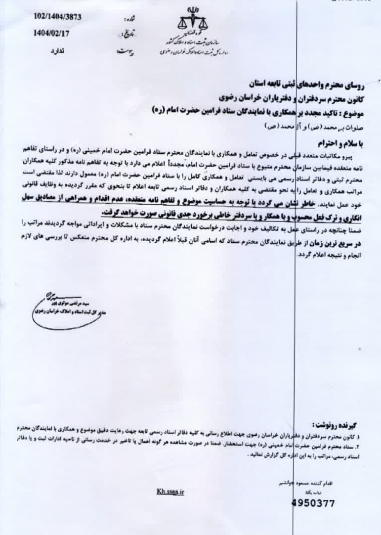 همکاری با نمایندگان ستاد اجرای فرامین امام (ره) اخبار سایتکمیته روابط عمومی ، رسانه و تشریفات بوسیله مدیر سایت به روز رسانی شده در اردیبهشت ۲۳, ۱۴۰۴ 0 تصویر نامه شماره 102/1404/3873 مدیر کل محترم ثبت استان مبنی بر همکاری با نمایندگان ستاد اجرای فرامین امام (ره) ⚜️روابط عمومی کانون سردفتران و دفتریاران خراسان رضوی⚜️ 🌐 سایت 📱 ایتا 📱 سروش 📱 تلگرام 📱 اینستاگرام