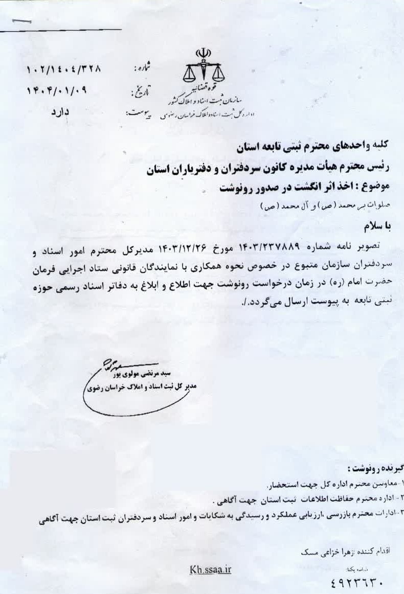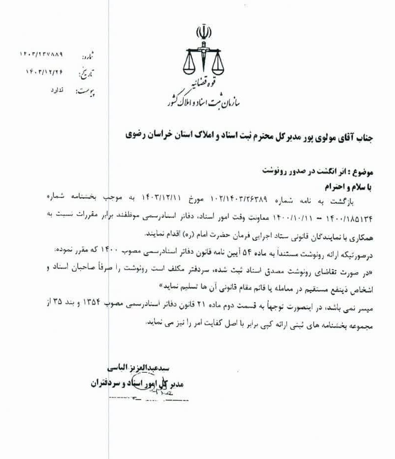 تصویر نامه شماره 1403/237889 مدیر کل امور اسناد و سردفتران و نامه شماره 102/1403/328 مدیر کل ثبت اسناد و املاک خراسان رضوی با موضوع همکاری با نمایندگان قانونی ستاد اجرایی فرمان حضرت امام (ره) جهت اطلاع و همکاری لازم برابر مقررات