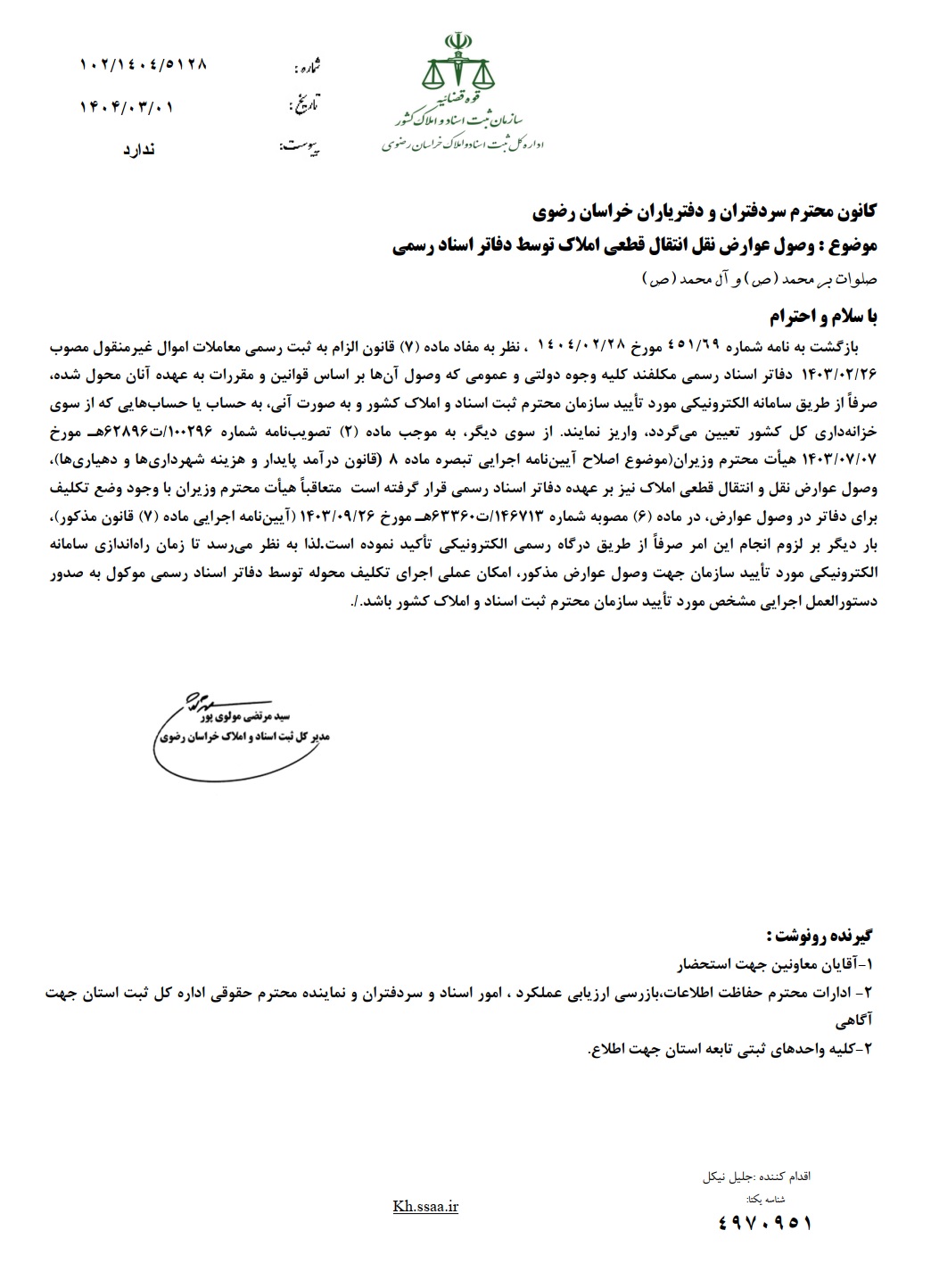 وصول عوارض انتقال شهرداری در صورت راه اندازی سامانه مورد تایید سازمان و یا صدور دستور العمل سازمان اخبار سایتکمیته روابط عمومی ، رسانه و تشریفات بوسیله مدیر سایت در خرداد ۴, ۱۴۰۴ 0 نامه مدیر کل ثبت استان در خصوص وصول عوارض انتقال شهرداری در صورت راه اندازی سامانه مورد تایید سازمان و یا صدور دستور العمل سازمان. ⚜️روابط عمومی کانون سردفتران و دفتریاران خراسان رضوی⚜️ 🌐 سایت 📱 ایتا 📱 سروش 📱 تلگرام 📱 اینستاگرام