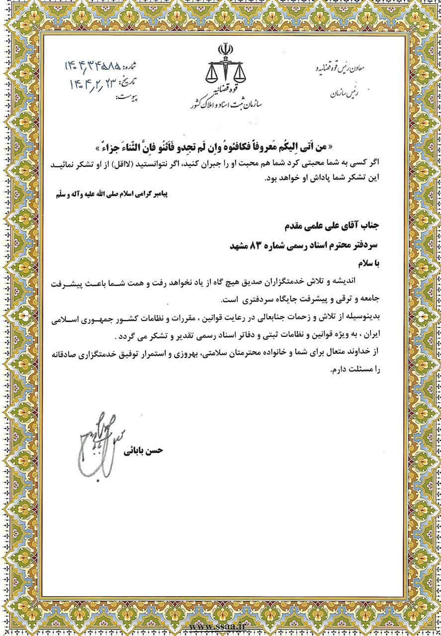 در راستای ماده ۵۸ آیین نامه قانون دفاتر اسناد رسمی مصوب ۱۴۰۰ آقای علی علمی مقدم سردفتر ۸۳ مشهد از سوی سازمان ثبت و اسناد و املاک کشور به عنوان سردفتر نمونه خراسان رضوی منتخب و از سوی ریاست محترم سازمان جناب آقای دکتر بابایی از ایشان تقدیر به عمل آمد.
