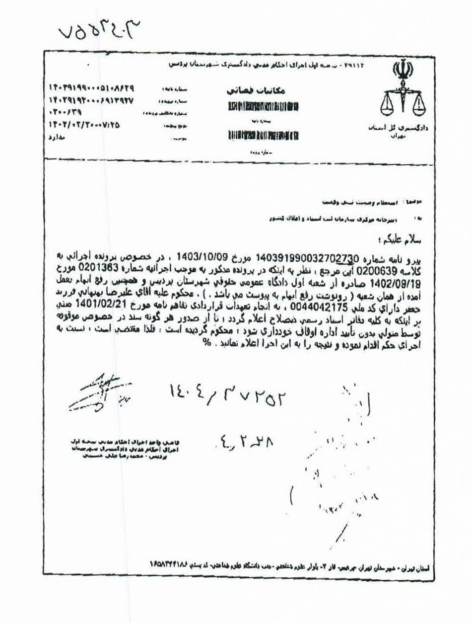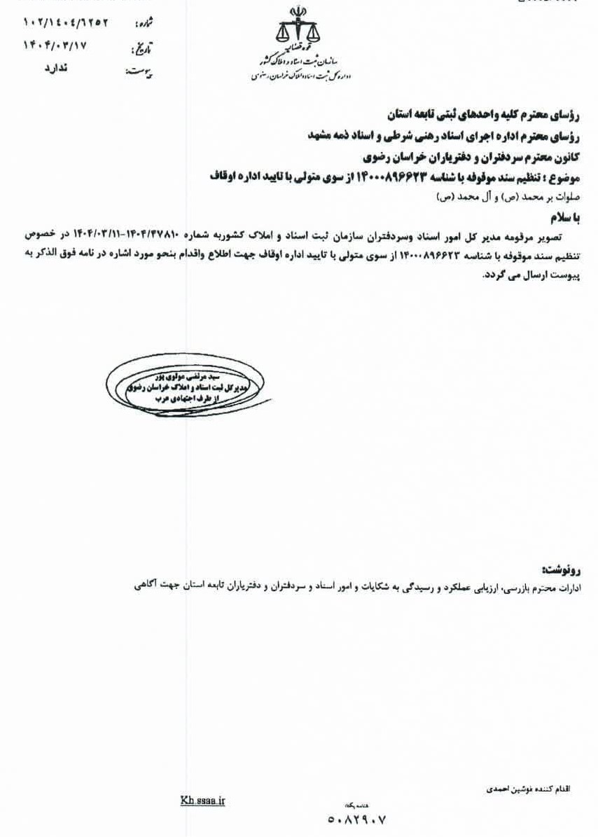 ممانعت از صدور هر گونه سند در خصوص موقوفه با شناسه ۱۴۰۰۸۹۶۶۲۲ اخبار سایتکمیته روابط عمومی ، رسانه و تشریفات بوسیله مدیر سایت در خرداد ۲۶, ۱۴۰۴ 0 تصویر نامه مدیرکل ثبت اسناد و املاک استان به انظمام مستندات با موضوع ممانعت از صدور هر گونه سند در خصوص موقوفه با شناسه ۱۴۰۰۸۹۶۶۲۲ توسط متولی بدون تایید اداره اوقاف ⚜️روابط عمومی کانون سردفتران و دفتریاران خراسان رضوی⚜️ 🌐 سایت 📱 ایتا 📱 سروش 📱 تلگرام 📱 اینستاگرام
