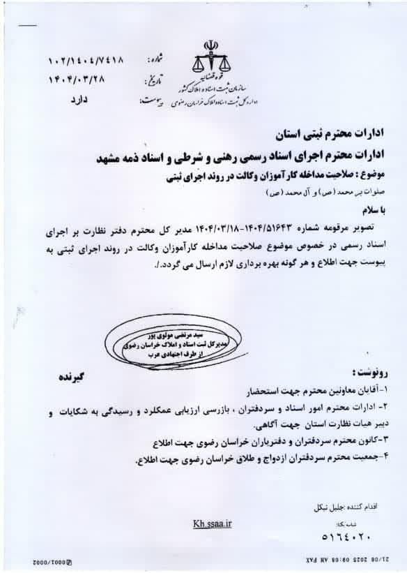 صلاحیت مداخله کارآموزان وکالت در روند اجرای ثبت اخبار سایتکمیته روابط عمومی ، رسانه و تشریفات بوسیله مدیر سایت در تیر ۲, ۱۴۰۴ 0 تصویر مرقومه مدیر کل ثبت استان با موضوع صلاحیت مداخله کارآموزان وکالت در روند اجرای ثبت ⚜️روابط عمومی کانون سردفتران و دفتریاران خراسان رضوی⚜️ 🌐 سایت 📱 ایتا 📱 سروش 📱 تلگرام 📱 اینستاگرام