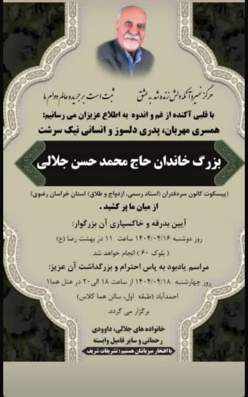 اطلاعیه ساعت و تاریخ مراسم تشییع و ترحیم مرحوم حاج محمدحسن جلالی اخبار سایتکمیته روابط عمومی ، رسانه و تشریفات بوسیله مدیر سایت به روز رسانی شده در تیر ۱۶, ۱۴۰۴ 0 بدینوسیله ساعت و تاریخ مراسم تشییع و ترحیم مرحوم حاج محمدحسن جلالی (سردفتر بازنشسته یک مشهد) به اطلاع همکاران گرامی میرسد. ⚜️روابط عمومی کانون سردفتران و دفتریاران خراسان رضوی⚜️ 🌐 سایت 📱 ایتا 📱 سروش 📱 تلگرام 📱 اینستاگرام