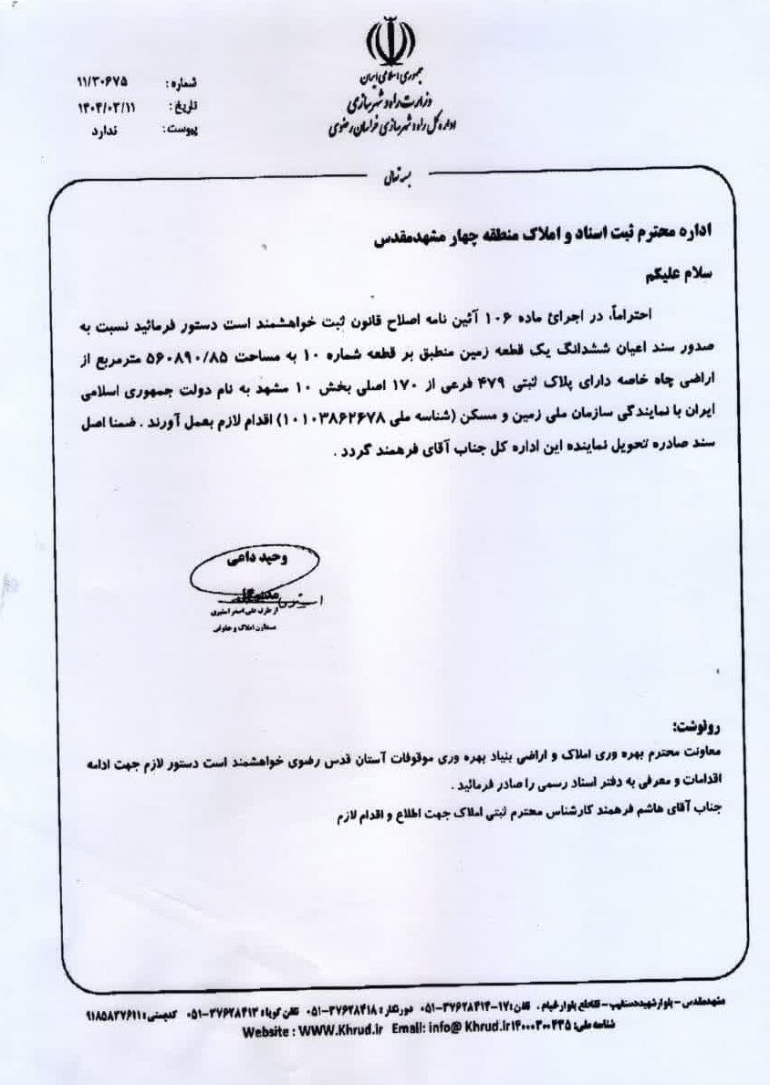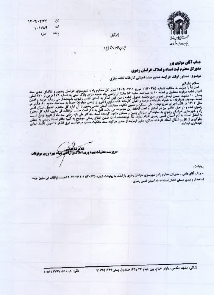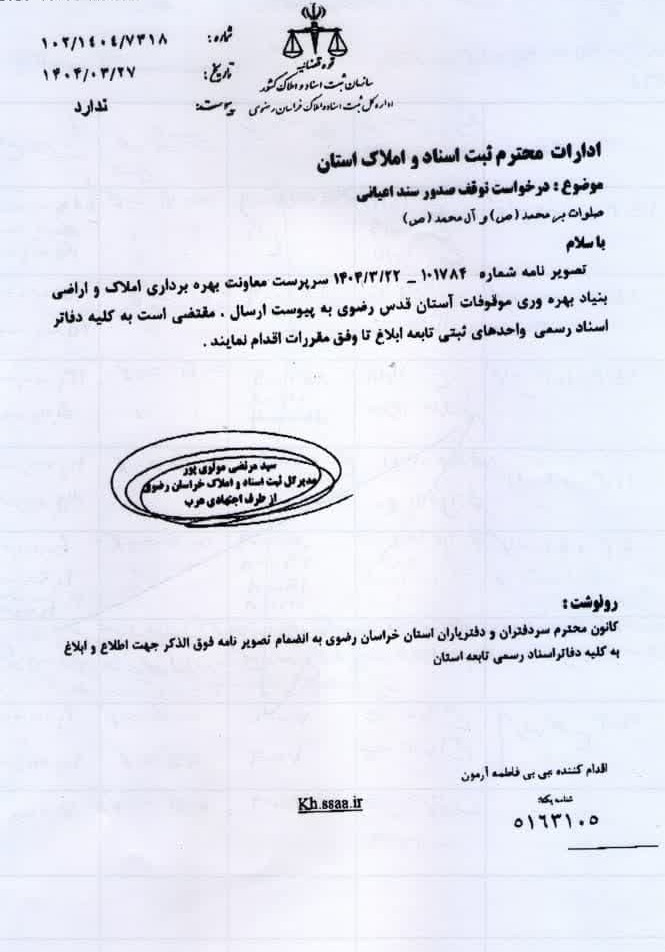 درخواست توقف صدور سند اعیانی بخشی از پلاک 479 فرعی از 170 اصلی بخش 10 مشهد اخبار سایتکمیته روابط عمومی ، رسانه و تشریفات بوسیله مدیر سایت به روز رسانی شده در مرداد ۶, ۱۴۰۴ 0 تصویر نامه شماره 102/1404/7318 اداره کل ثبت اسناد و املاک استان خراسان و منضمات آن با موضوع درخواست توقف صدور سند اعیانی بخشی از پلاک 479 فرعی از 170 اصلی بخش 10 مشهد ⚜️روابط عمومی کانون سردفتران و دفتریاران خراسان رضوی⚜️ 🌐 سایت 📱 ایتا 📱 سروش 📱 تلگرام 📱 اینستاگرام