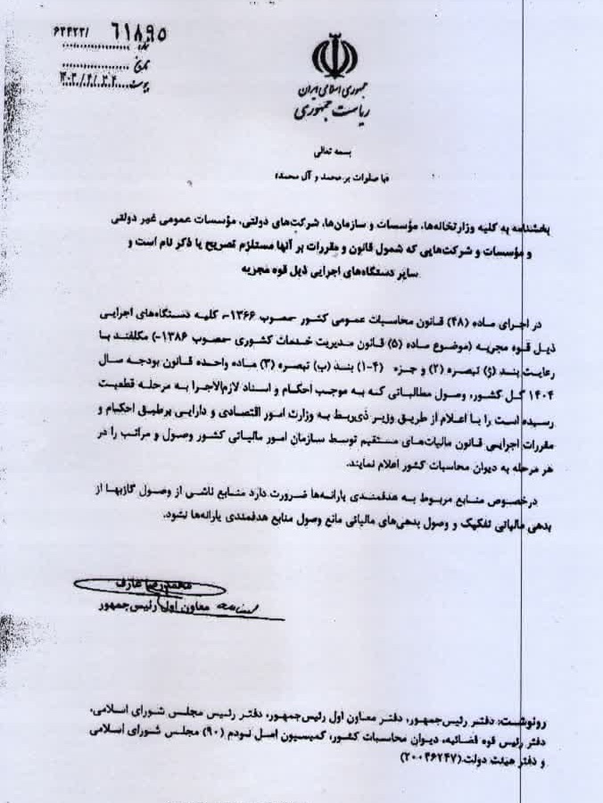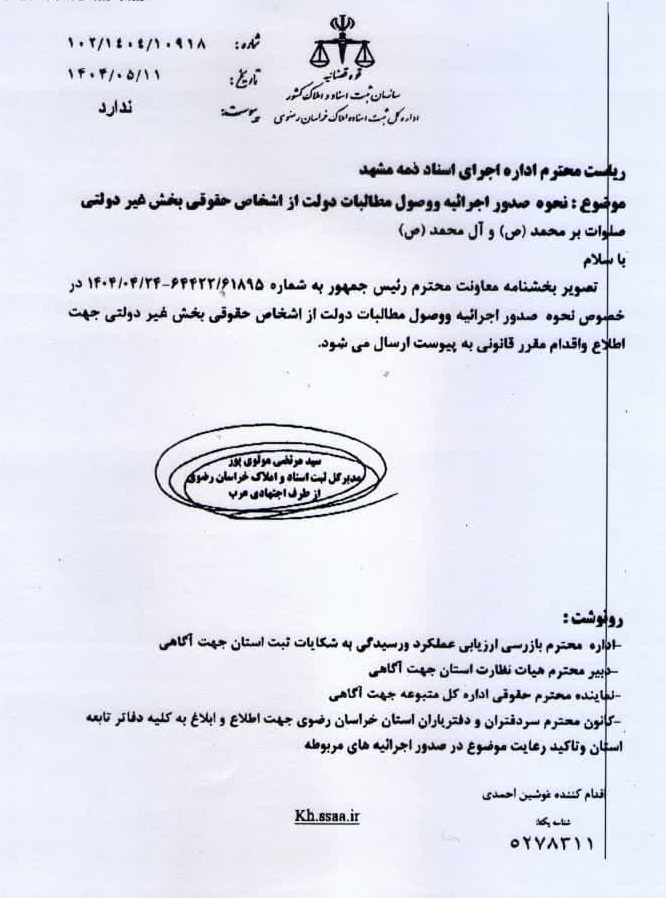 نحوه صدور اجرائیه و وصول مطالبات دولت از اشخاص حقوقی بخش غیر دولتی اخبار سایتکمیته روابط عمومی ، رسانه و تشریفات بوسیله مدیر سایت در مرداد ۱۳, ۱۴۰۴ 0 تصویر نامه مدیر کل ثبت استان و تصویر نامه معاون اول رئیس جمهور با موضوع نحوه صدور اجرائیه و وصول مطالبات دولت از اشخاص حقوقی بخش غیر دولتی ⚜️روابط عمومی کانون سردفتران و دفتریاران خراسان رضوی⚜️ 🌐 سایت 📱 ایتا 📱 سروش 📱 تلگرام 📱 اینستاگرام
