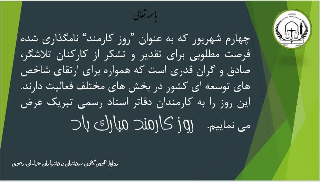 چهارم شهریور که به عنوان “روز کارمند” نامگذاری شده فرصت مطلوبی برای تقدیر و تشکر از کارکنان تلاشگر، صادق و گرانقدری است که همواره برای ارتقای شاخص های توسعه ای کشور در بخش های مختلف فعالیت دارند. این روز را به کارمندان دفاتر اسناد رسمی تبریک عرض می نماییم.