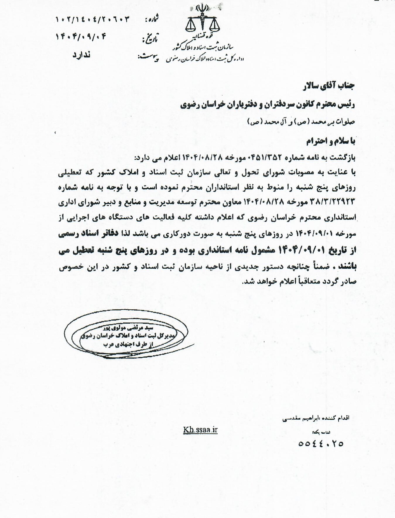 تصویر نامه شماره 102/1404/20603مورخ 1404/09/04 مدیر کل محترم ثبت اسناد و املاک استان خراسان رضوی در خصوص اجرایی شدن تعطیلی دفاتر اسناد رسمی در روز های پنج شنبه جهت اطلاع همکاران به پیوست ارسال می گردد.