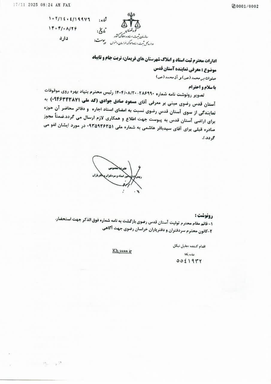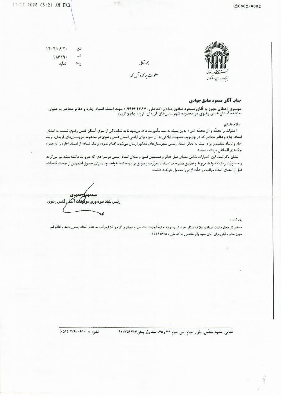 تصویر نامه شماره 102/1404/19976 مورخ 1404/08/26 اداره کل محترم ثبت اسناد و املاک خراسان رضوی و نامه شماره 286990 مورخ 1404/08/20 بنیان بهره وری موقوفات آستان قدس رضوی مبنی بر معرفی آقای مسعود صادق جوادی به عنوان نماینده جدید آستان قدس در خصوص امضای اسناد اجاره و دفاتر محاضر شهرستان های فریمان،تربت جام و تایباد جهت اطلاع همکاران گرامی.