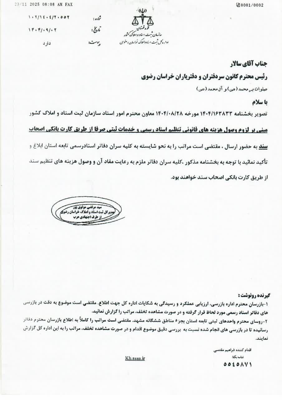 تصویر نامه شماره 102/1404/20552 مورخ 1404/09/02 مدیر کل محترم ثبت اسناد و املاک خراسان رضوی در خصوص بخشنامه شماره 96/223633 مورخ 1396/11/07معاون محترم امور اسناد سازمان ثبت اسناد و املاک کشور که طی آن سردفتران اسناد رسمی مکلفند هزینه های قانونی تنظیم اسناد رسمی و خدمات ثبتی را از طریق کارت بانکی اصحاب سند و از طریق دستگاه کارت خوان متصل به سامانه ثبت الکترونیک اسناد رسمی اخذ نمایند، جهت اطلاع همکاران و رعایت مفاد بخشنامه مذکور به پیوست ارسال می گردد.