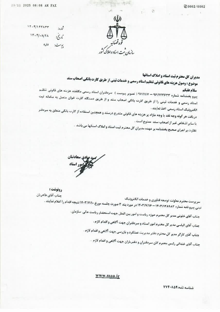 ⭕️ هزینه های قانونی تنظیم اسناد رسمی و خدمات ثبتی از طریق کارت بانکی اصحاب سند وصول شود