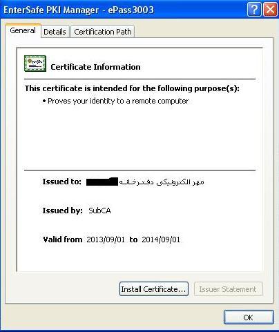 برای اطلاع از تاریخ اعتبار گواهی خود بایستی روی آیکن توکن در کنار ساعت ویندوز دوبار کلیک نموده و در کادر باز شده روی لاگین کلیک نموده و با وارد کردن رمز توکن وارد توکن شوید در این قسمت در سمت چپ روی عنوان " مهر الکترونیکی دفترخانه …" دوبار کلیک نموده و در کادر باز شده، در انتهای کادر تاریخ اعتبار گواهی به میلادی مشخص شده است.